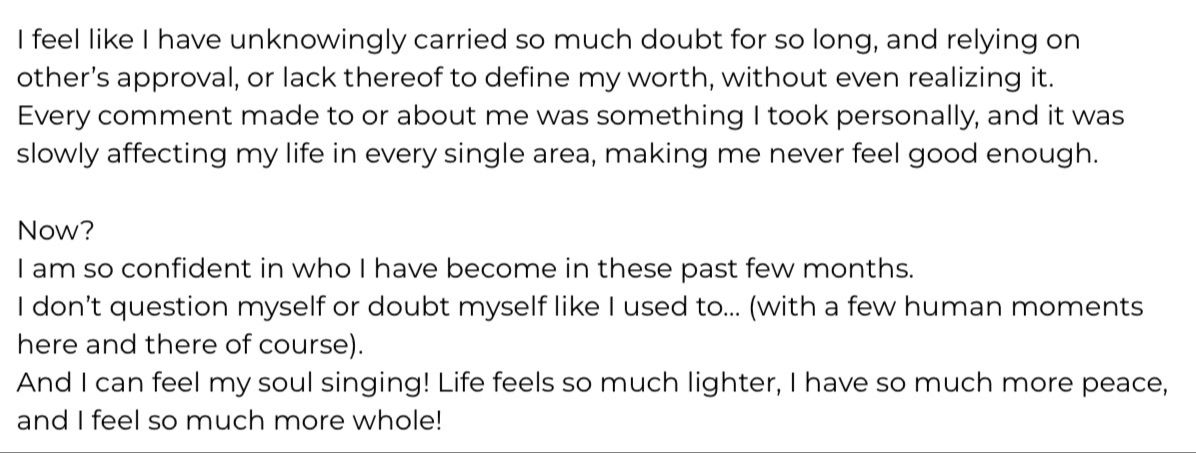Customized tools: These come directly from your Higher Self, so that they’re 97%+ effective in helping you shift + reprogram to get the quickest results possible. Tools can include subconscious reprogramming statements, somatic exercises, journal prompts, energy work, physical actions, and really anything your Higher Self knows will change the game for you.