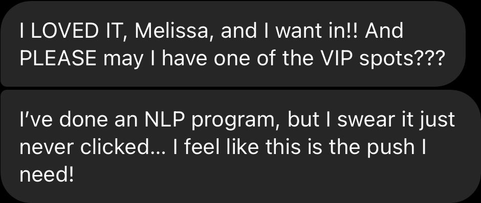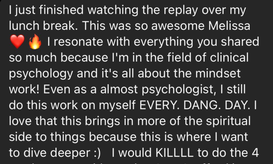 As an MCM student, you have the opportunity to book a VIP upgrade with Melissa. This will be a private 1-hour intuitive read where Melissa will read your energy to find exactly where you're energetically blocked, channel for you specifically, and acquire the tools to shift those energetic blocks & make you a match for anything you desire.